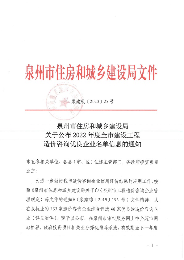 恭喜建融集團獲得2022年度建設工程造價(jià)咨詢(xún)優(yōu)良企業(yè)